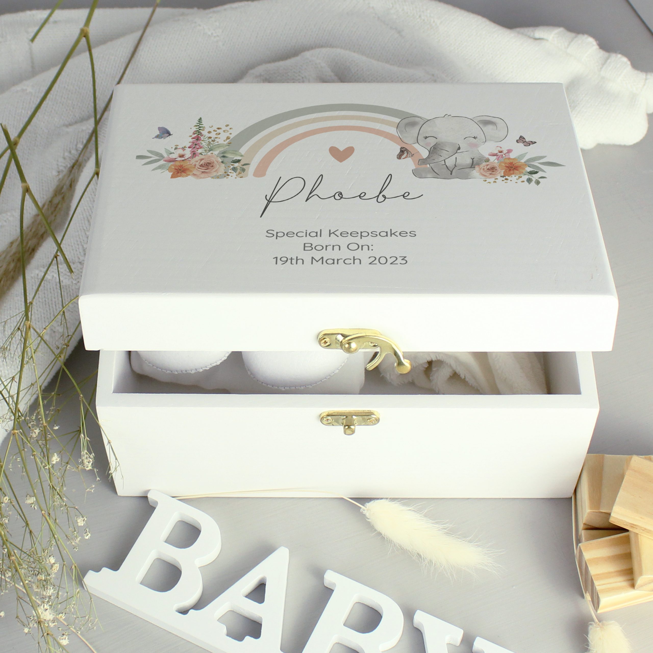 This cute elephant wooden keepsake box is perfect for storing their most important souvenirs and keepsakes.